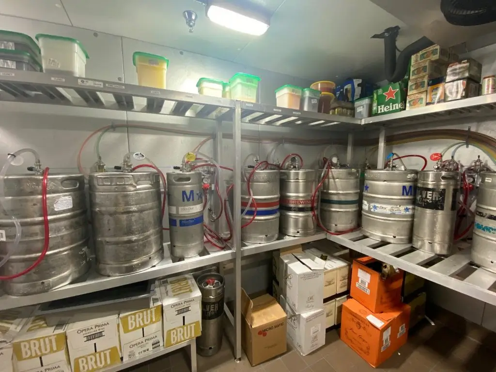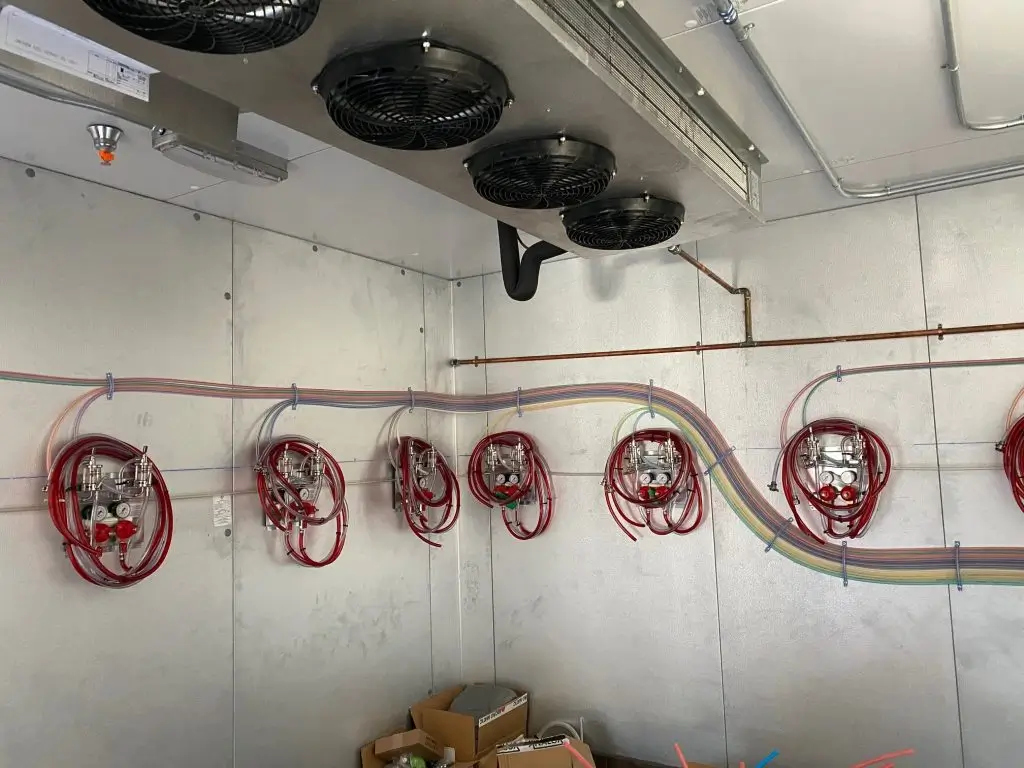 Finally, the beer and wine kegs were connected in the order specified by the bar manager. We inspected connections for any leaks and tested for proper pouring and temperature.