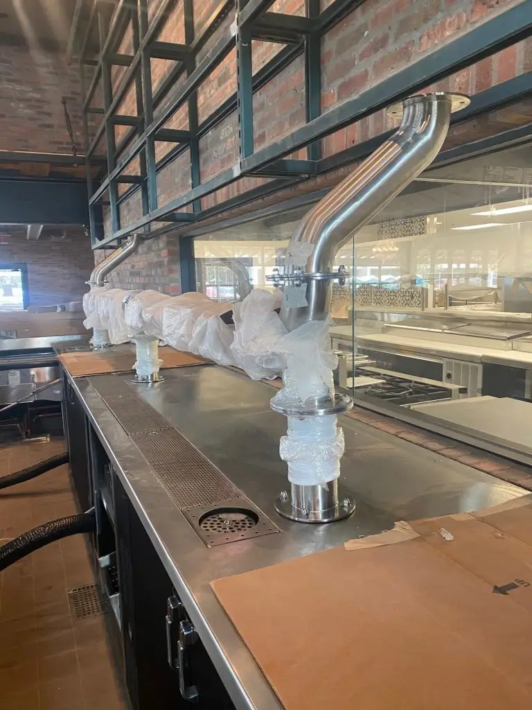 We cut holes out of the counter top with a plasma cutter in order to mount the beer and wine towers. The beer & wine towers were assembled and then bolted to counter tops.